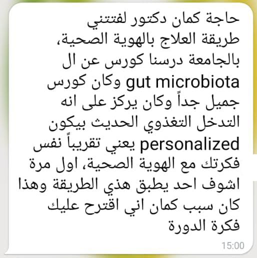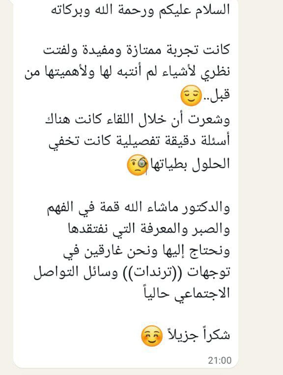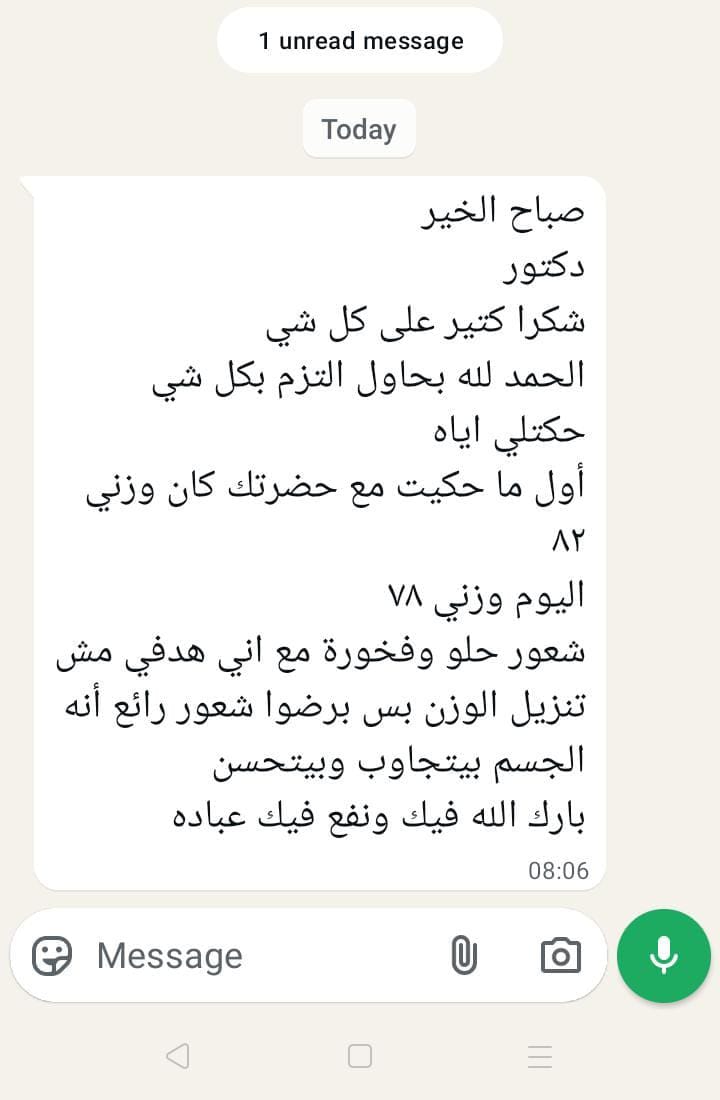 الجلسة كانت مميزة أنتبهت لأكثر من معلومة ، و وضعت يدى علي العادات الصحية الجيدة التي اقوم بها و العادات التي تحتاج إلى شغل وجهني الدكتور ونصحني بعدة أمور للفترة المقبلة إن شاء الله. ف جزاكم الله خيرا و اللهم زد وبارك . بالتوفيق والفلاح دائماً بإذن المولى