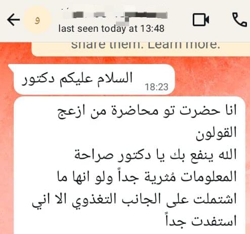 بداية معرفتي ل د. أحمد ممتاز كانت من خلال "ويبينار من أزعج القولون" وأعجبت بأسلوب طرح الدكتور والمعلومات المستفادة والقيمة (مثلا لم أكن أعلم عن وظيفة القولون وعن الارتباط بين هذه العملية والإدارة العصبية والهرمونية، والعديد من المعلومات المتعلقة بالعلاقة بين القولون ومختلف أعضاء الجسد وخصوصا بسبب تموضوع القولون) وتصحيح بعض المعلومات الخاطئة. والاهتمام بكل حالة فردية مع التطرق للفوارق الفردية والانتباه المختلف العوامل سواء كانت فكرية نفسية او صحية وحياتية. ومن ثم كان اللقاء الأول مع د. من خلال استشارة، ولمست تفهم وضعي والاهتمام الدراسة حالتي وتقديم النصح والإرشاد، هذا بالإضافة الى الطابع الإنساني الذي يميز شخصيته الكريمة."