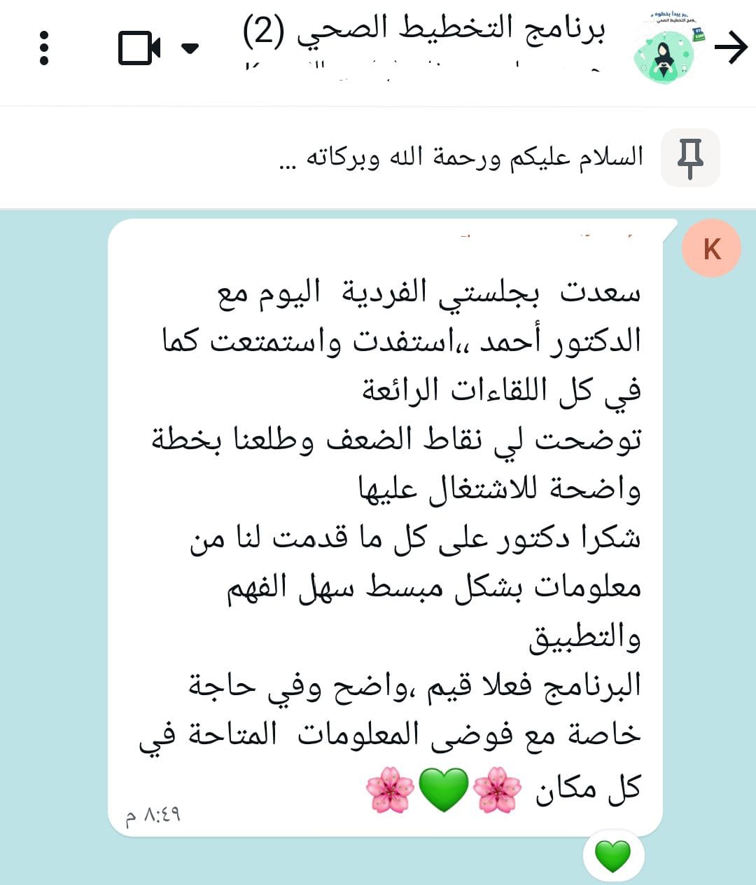 أتمنى من الله عز وجل أن يعطيكم الصحة والعافية ، شكراً جزيلاً على ما قدمتموه لي من إرشاد صحي ، وأحمد الله تعالى أن يسر لي هذا البرنامج الذي استطاع أن يغير كثيراً من عاداتي اليومية السيئة ، لقد ساعدني لأغدو شخصا أفضل بعادات صحية ، أكن لكم خالص المودة والتقدير🥀